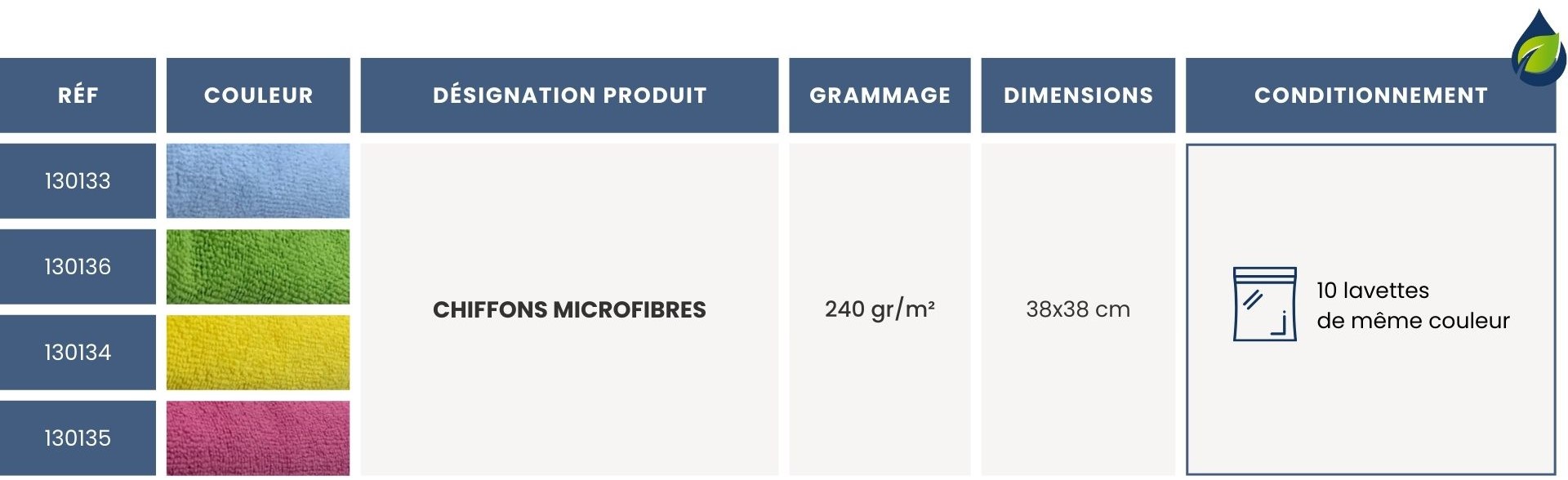 microfibre (20) microfibres (12) lavette (11) chiffon (9) lavettes (9) chiffons (8) cobic (8) nettoyants (7) couleur (6) surfaces (6)