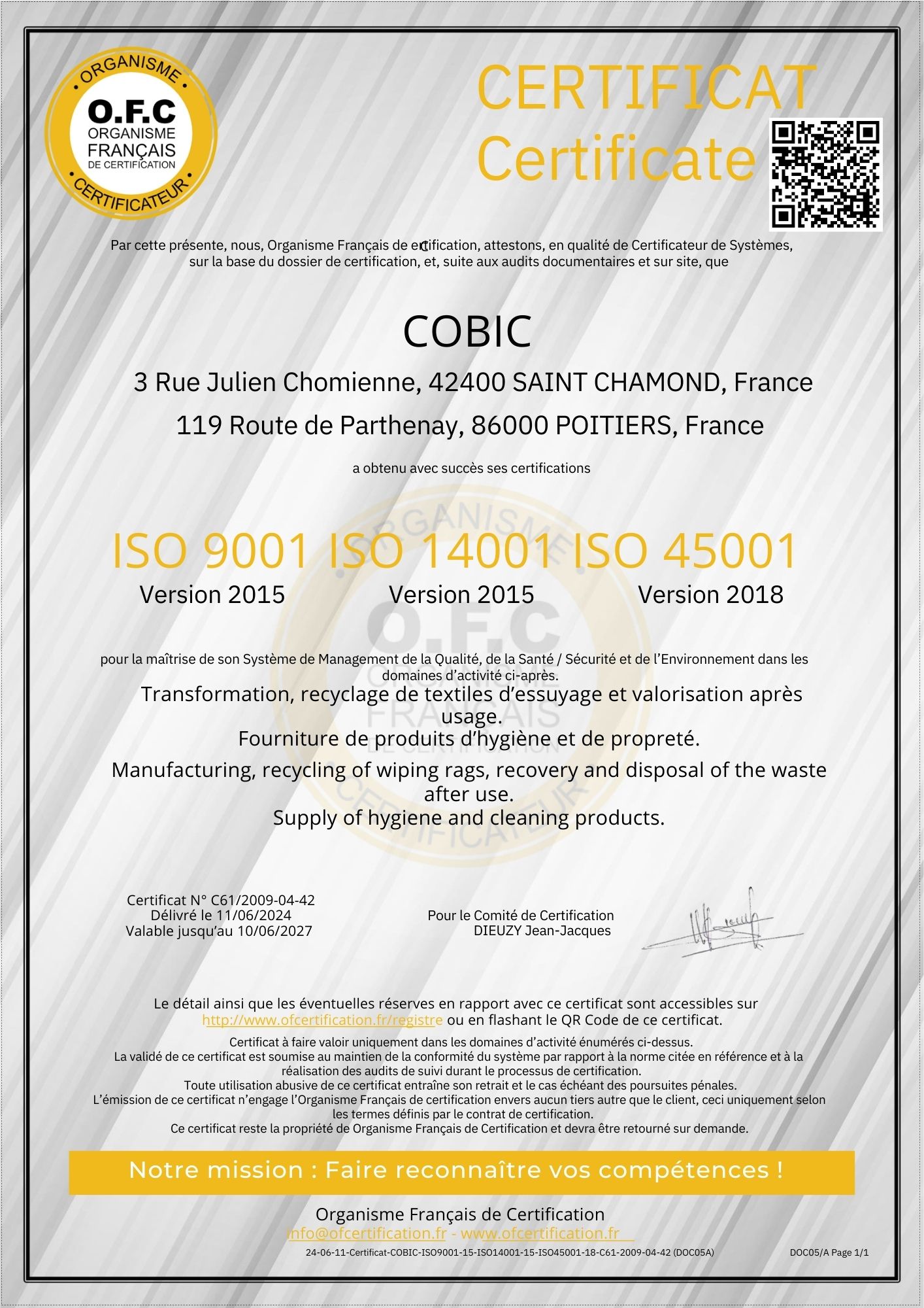 La société COBIC est certifiée:
