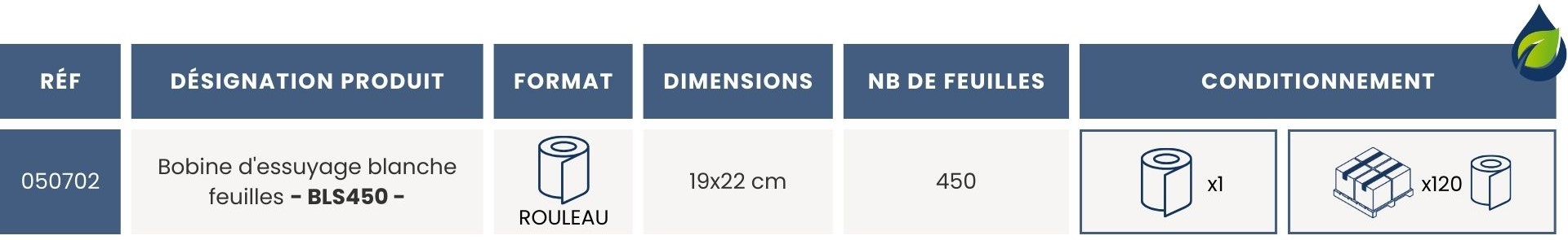 Composée de 450 feuilles blanches à double épaisseur, la bobine en pure ouate de cellulose est très résistante et a une grande capacité d’absorption.